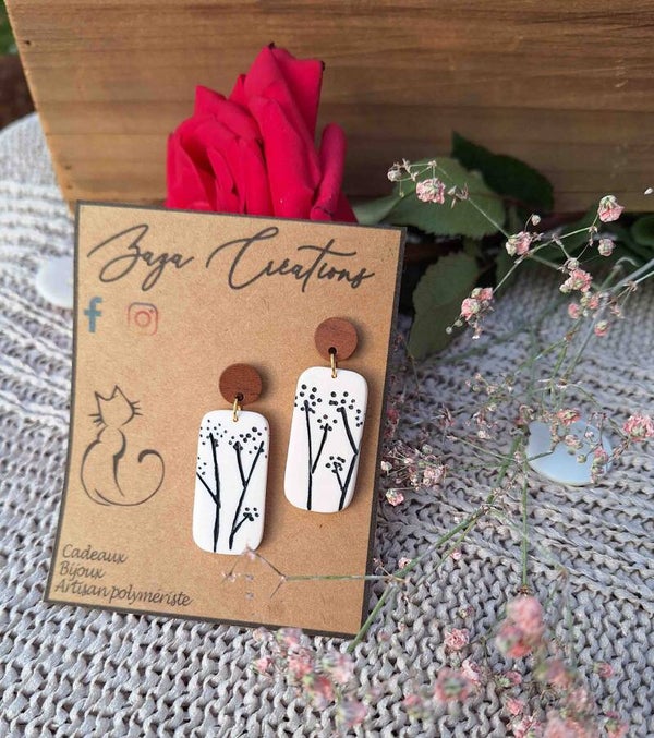 Boucles d'oreilles artisanales en pâte polymère polie, crochet d'oreille en bois & acier inoxydable.